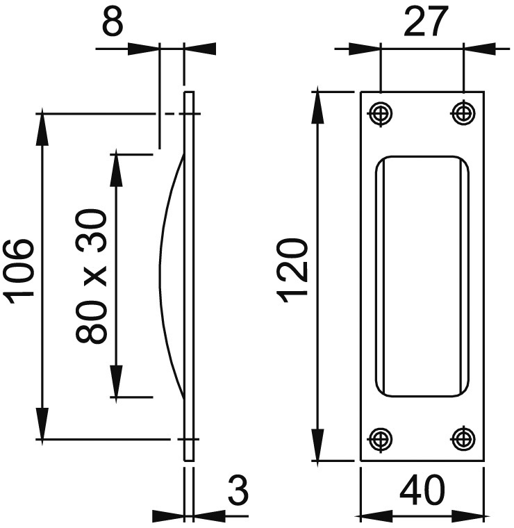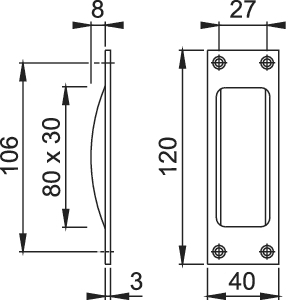 HOPPE®, Zimmertür-Schiebetürmuschel, Modellnummer: 421P, Lochung: Blind, Form: eckig, Material: Aluminium, Farbton: neusilberfarbig, Oberfläche: eloxiert, Befestigungsart: zum Einlassen, zum Anschrauben, Länge: 120 mm, Breite: 40 mm, Tiefe: 11 mm, DIN-Richtung: DIN Links-Rechts, Türart: Schiebetür, Türflügelanzahl: einflügelig, Türwerkstoff: Holz