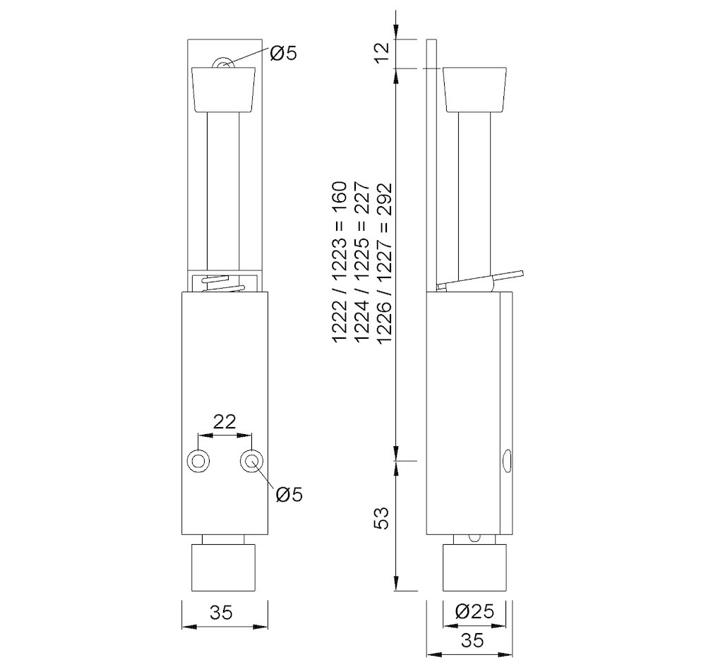 KWS Objekttür Türfeststeller, Ausführung: mit Tretbolzen, mit Gummistopfen, mit Konterfeder, mit Klemmplatte, Modellnummer: 1223, Befestigungsart: zum Aufschrauben, Material: aluminium, Farbton: edelstahloptik, Oberfläche: eloxiert, geschliffen, poliert, Länge: 160 mm, Breite: 35 mm, Tiefe: 35 mm, Hub: 60, DIN-Richtung: DIN Links-Rechts, Türgewicht max.: 40 kg, Material Tretbolzen: edelstahl, Farbe Gummi: schwarz, Bodenklobeneigenschaft: Kloben mit Gummipuffer, Anzahl Schraublöcher: 3 St., Schraublochdurchmesser: 5 mm